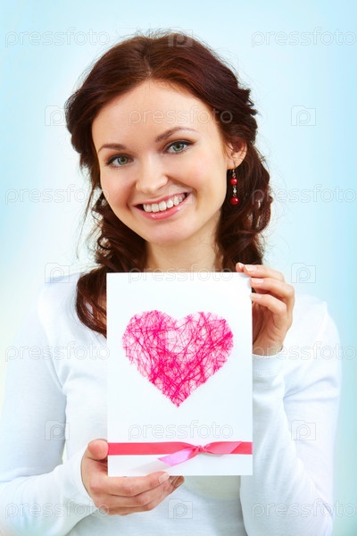 Улыбающаяся девушка с любовной открыткой на голубом фоне