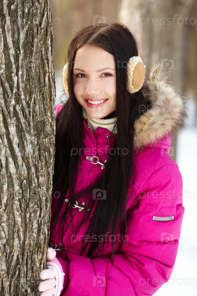 Симпатичная девушка в зимней одежде стоит рядом с деревом