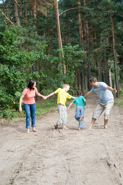 Семья из четырех человек гуляет в лесу