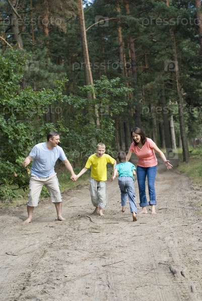 Семья из четырех человек гуляет в лесу