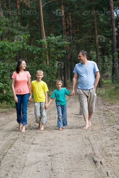 Семья из четырех человек гуляет в лесу