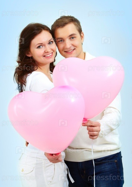 Молодая влюбленная пара с розовыми воздушными шарами в форме сердец на голубом фоне