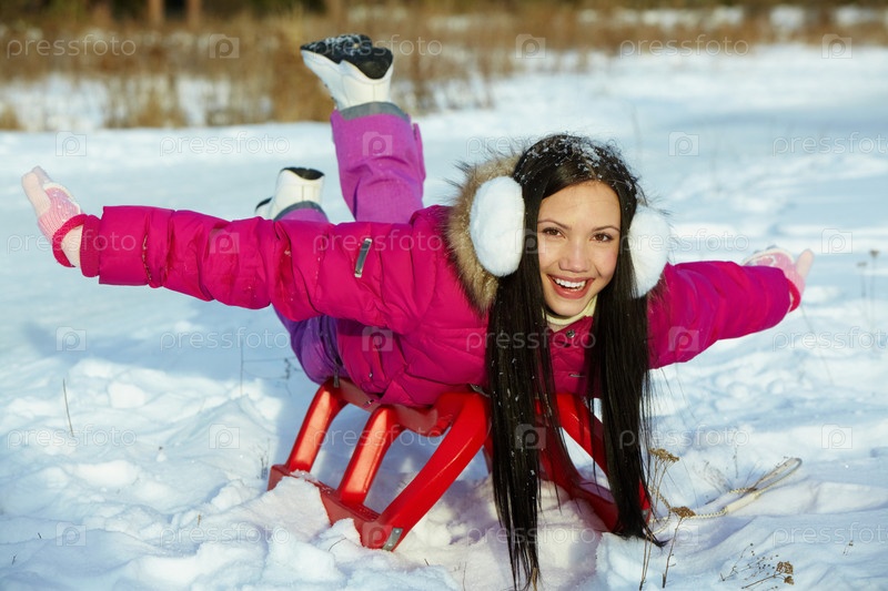 Красивая девушка катится на санках