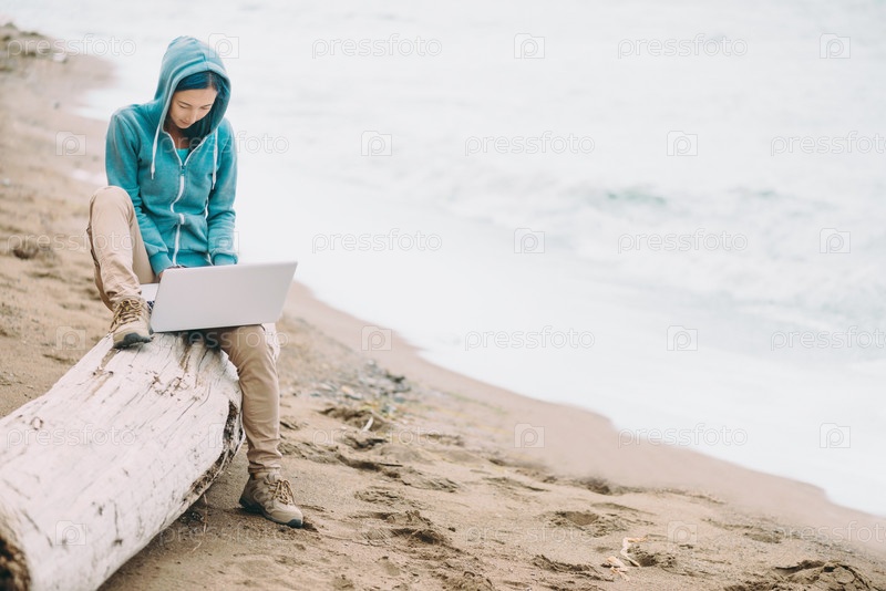 Девушка с ноутбуком на пляже