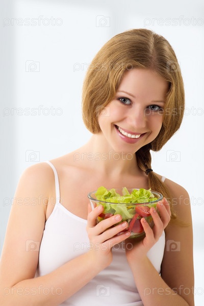 Красивая молодая девушка держит в руках миску с салатом