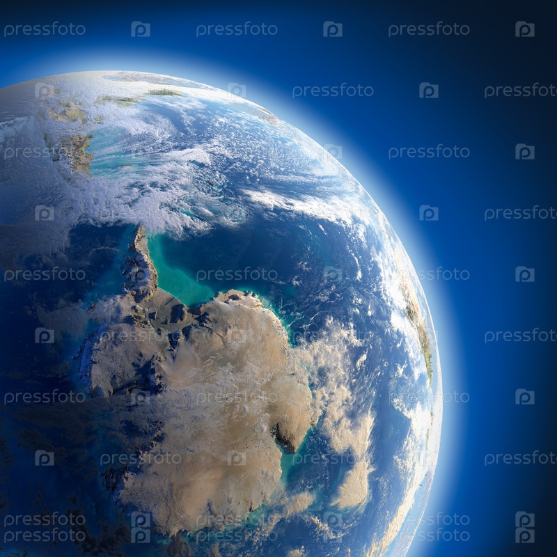 Фрагмент земного шара (южный полюс) с подробным рельефом и атмосферой, освещенной солнцем, в космическом пространстве