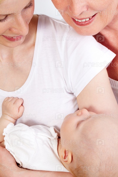 Мать и дочь с ребенком на белом фоне
