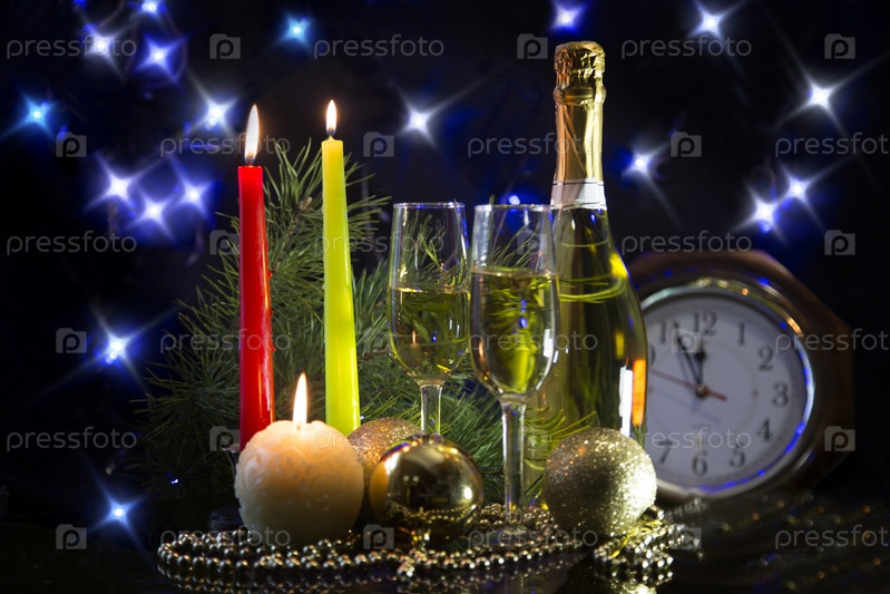 Новогодняя открытка с шампанским и свечами
