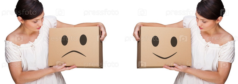 Девушка переносит коробку со смайликом