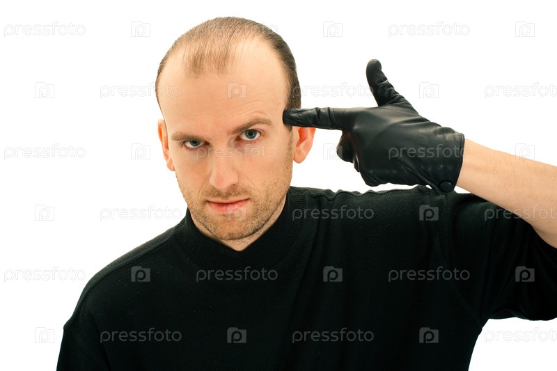Упавший в депрессию мужчина ставит палец на свою склепу, изолированную от белого фона