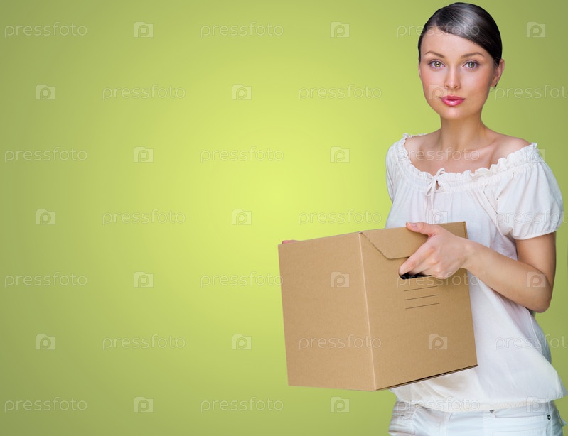 Элегантная брюнетка с картонной коробкой на светло-зеленом фоне