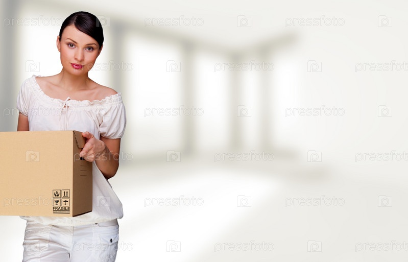 Элегантная брюнетка с картонной коробкой в пустой комнате