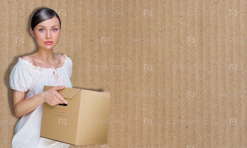 Элегантная брюнетка с картонной коробкой на фоне гофрированного картона