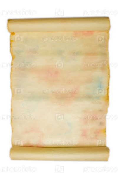Рулон старой испачканной бумаги на белом фоне