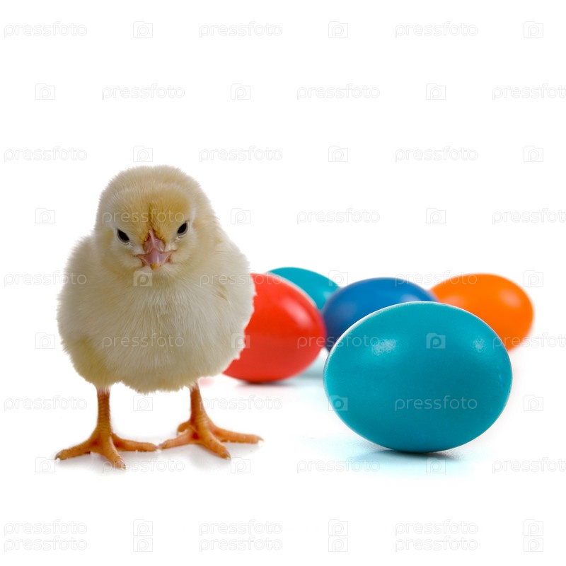 Пасхальные яйца и цыпленок на белом фоне