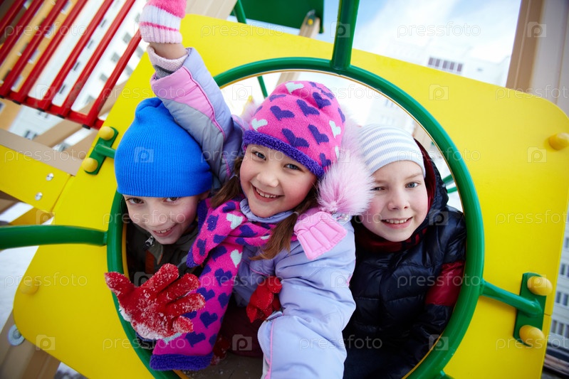 Трое детей играют на детской площадке зимой