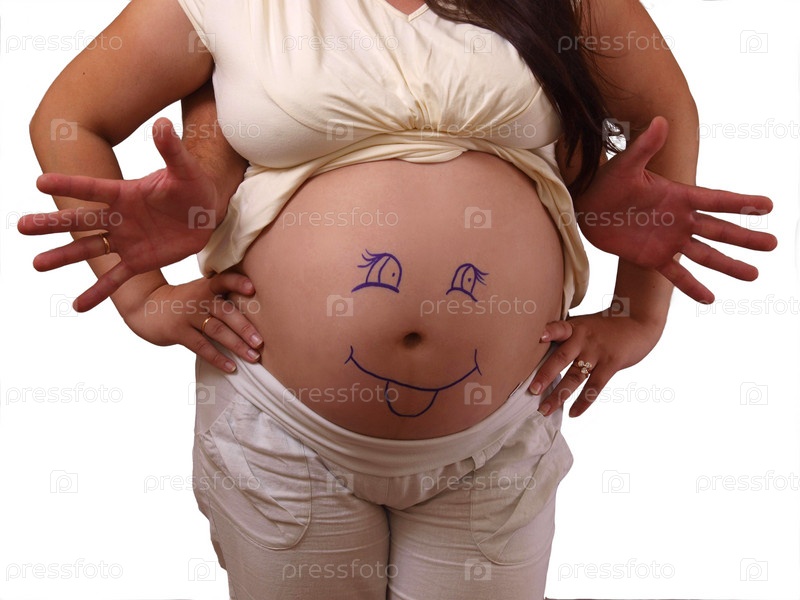 Нарисованная рожица на животе беременной женщина и руки мужа