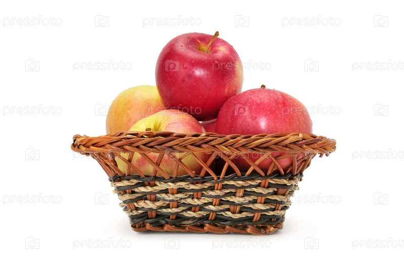 Яблоки в корзине, изолированные на белом фоне