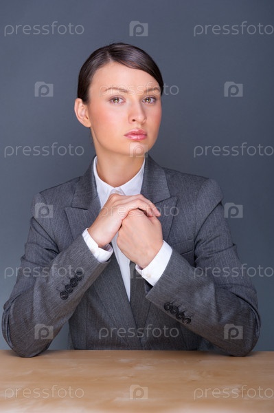 Серьезная молодая бизнес-леди сидит за столом