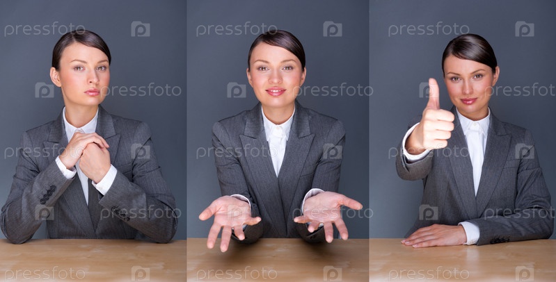 Молодая бизнес-леди сидит за столом, коллаж