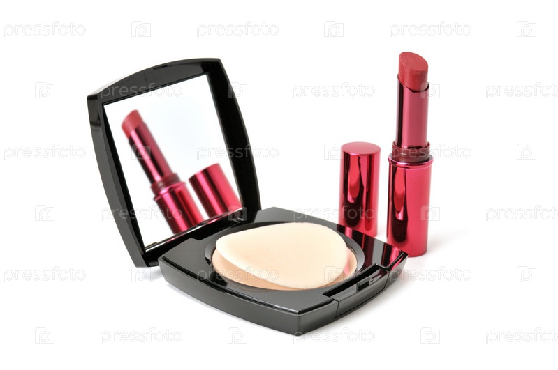 Открытая пудреница и помада, изолированная на белом фоне