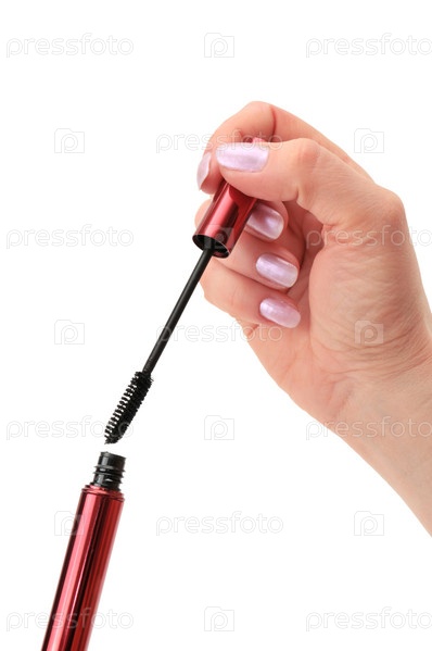 Тушь для ресниц в руке, изолированная на белом фоне