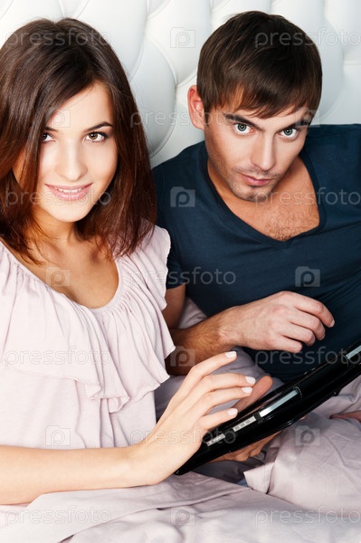 Молодая пара с планшетным компьютером в кровати