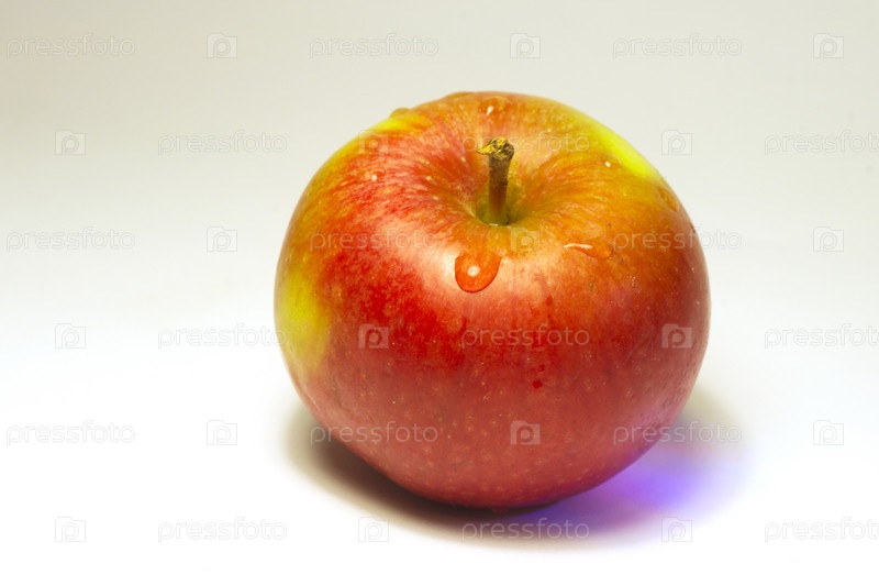 Желто-красное чистое яблоко на светлом фоне
