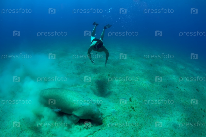 Свободно ныряющий человек и ламантин в глубине моря