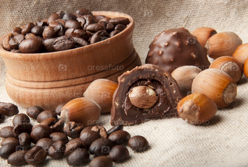 Кофейные зерна, лесные орехи и шоколадная конфета