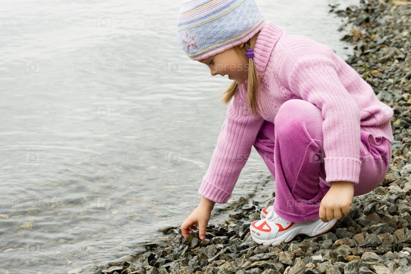 Красивая девушка в фиолетовой одежде, прикасающаяся к галькам у реки