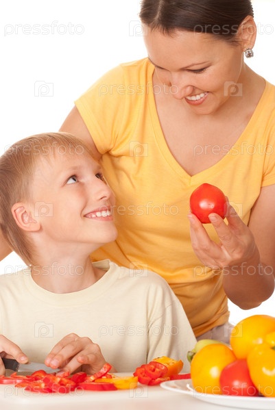 Счастливые мать и сын готовят завтрак