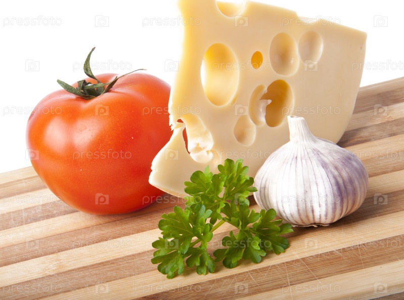 Чеснок, томат и сыр на деревянной доске