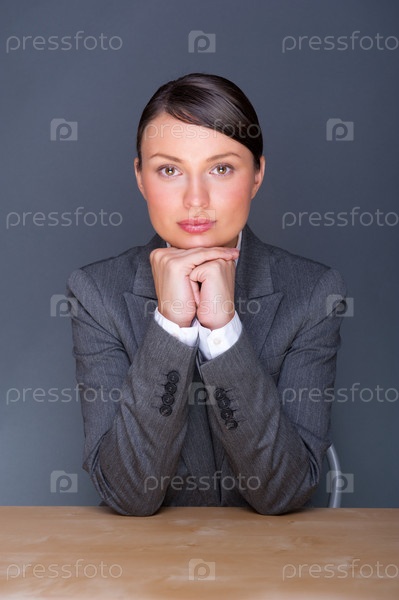 Бизнес-леди сидит за офисным столом на сером фоне