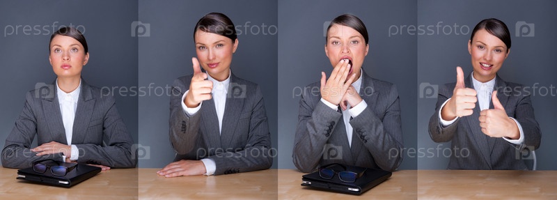 Бизнес-леди сидит за офисным столом, коллаж