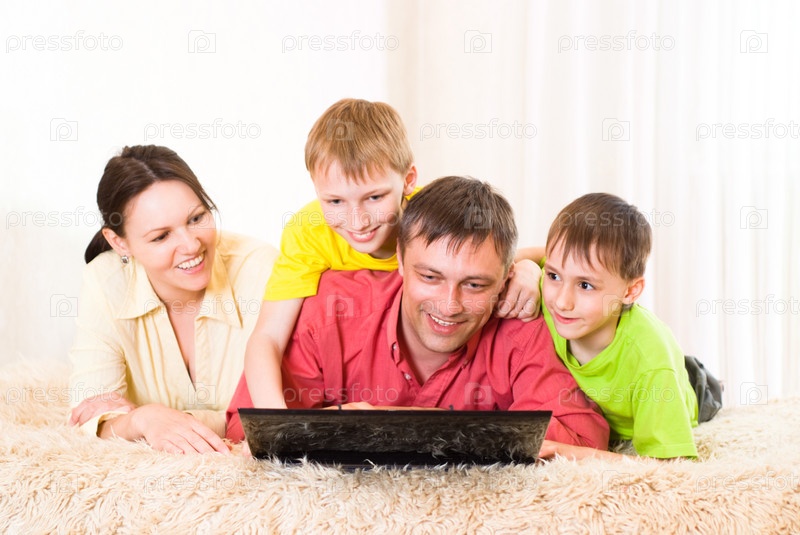 Портрет семьи с ноутбуком в помещении