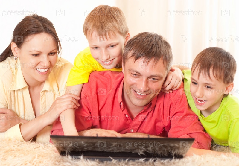 Портрет семьи с ноутбуком в помещении