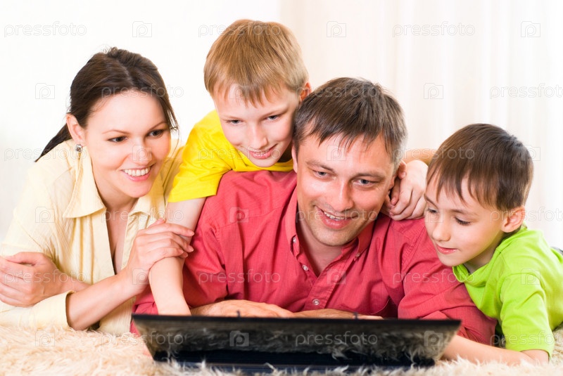 Портрет семьи с ноутбуком в помещении