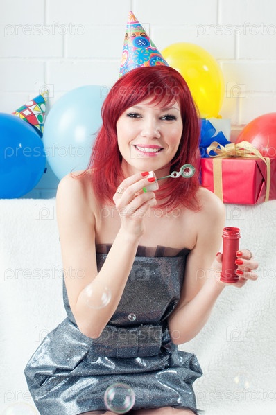 Счастливая рыжеволосая девушка пускает мыльные пузыри