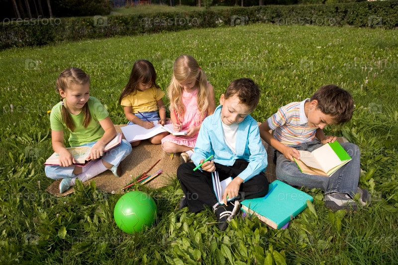 Портрет милых детей, которые вместе читают книги и рисуют в парке
