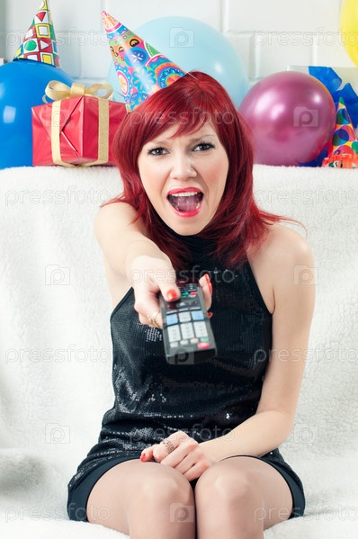 Кричащая девушка в праздничном колпаке с пультом от телевизора