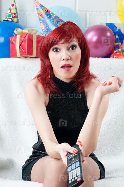 Удивленная девушка в праздничном колпаке смотрит телевизор