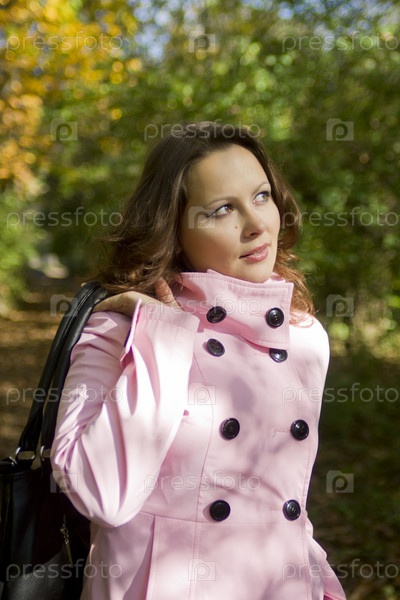 Девушка в розовом пальто в осеннем парке