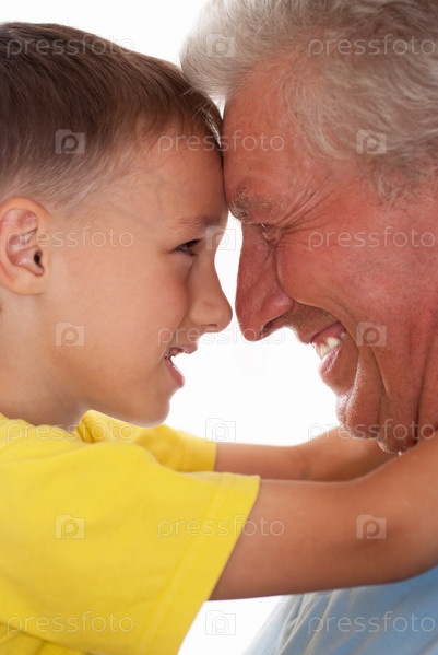 Дед и внук на белом фоне