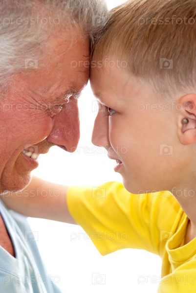 Дед и внук на белом фоне