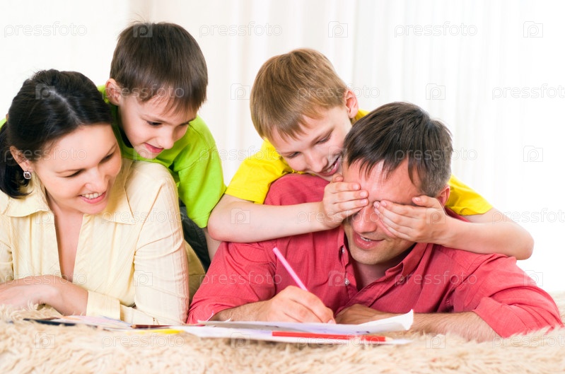 Портрет семьи, рисующей лежа на ковре