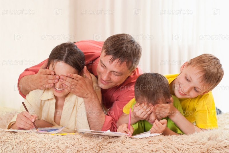 Портрет семьи, рисующей лежа на ковре