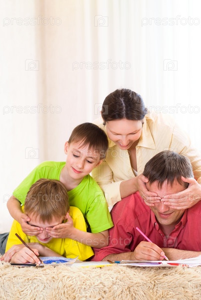 Портрет семьи, рисующей лежа на ковре