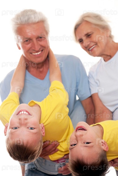 Бабушка и дедушка с внуками на белом фоне