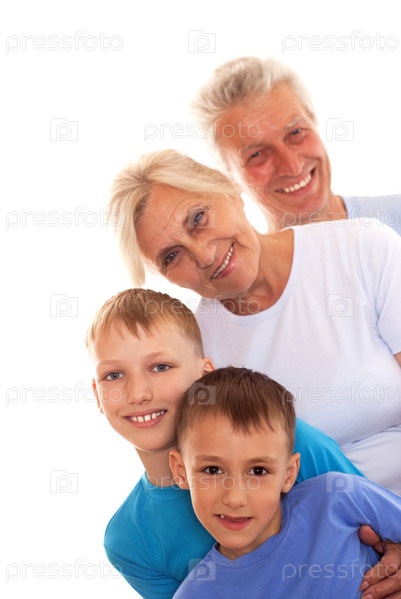 Бабушка и дедушка с внуками на белом фоне